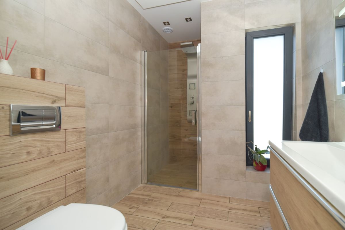 Piętro: korytarz (12,52m2), pokój z garderobą I (15,57m2), pokój II (11,88m2), pokój z garderobą III (20,02m2), łazienka z wanną (9,42m2), pralnia (6,05m2).