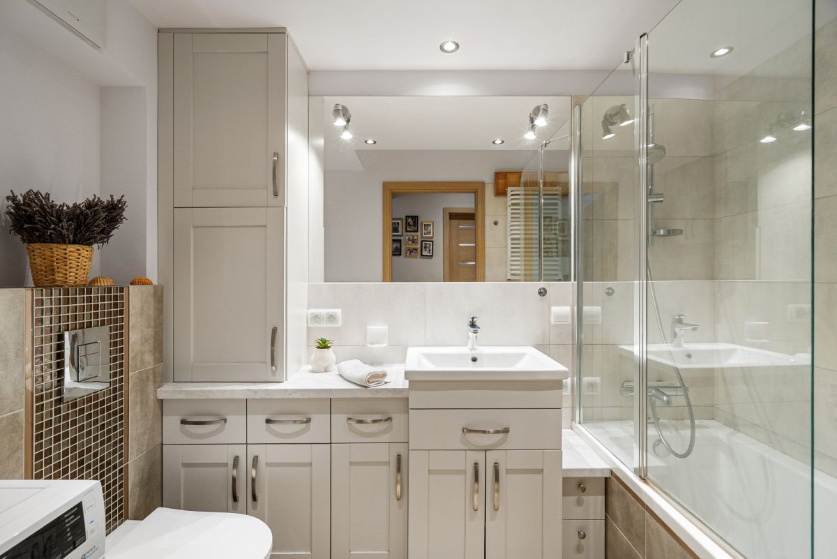 W sypialni, salonie oraz łazienkach zabudowa stała zaprojektowana u stolarza.