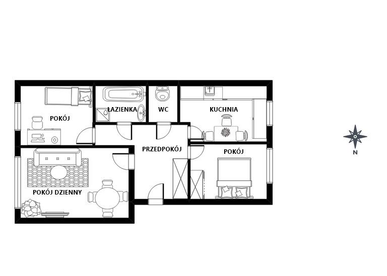 Lokal o powierzchni 60,10 m2 ma wygodny rozkład pomieszczeń.
