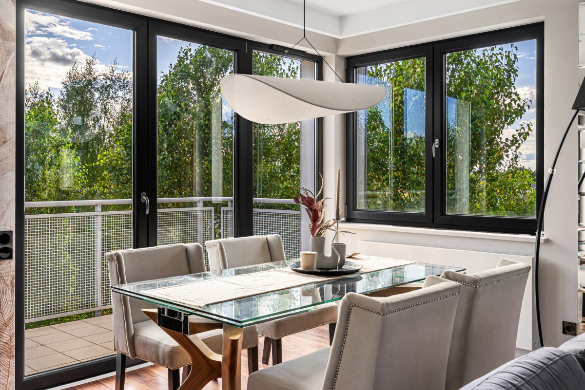 Stolarka okienna PCV- wewnętrza okleina grafitowa, parapety z marmuru, drzwi antywłamaniowe.