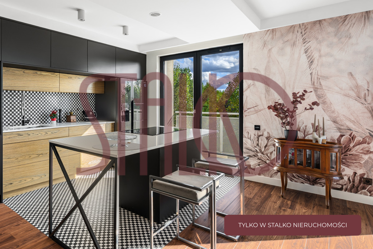Kuchnia: zabudowa wraz ze sprzętem AGD- system Blum (lodówka z kostkarką, zmywarka, płyta indukcyjna), duża wyspa, ogrzewanie podłogowe.