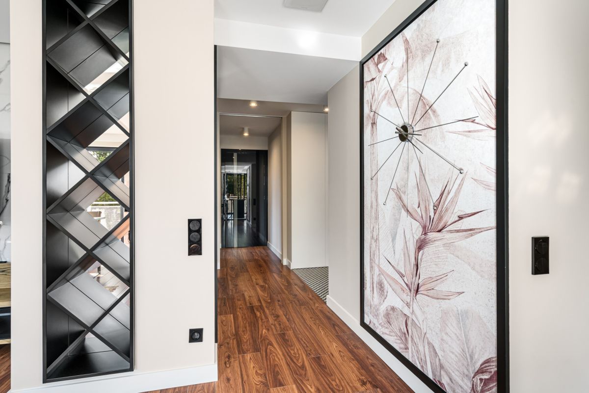 Przedpokój: szafa oraz garderoba mieszcząca sprzęty gospodarstwa domowego, deska do prasowania, żelazko, odkurzacz, pralko-suszarka, ogrzewanie podłogowe.