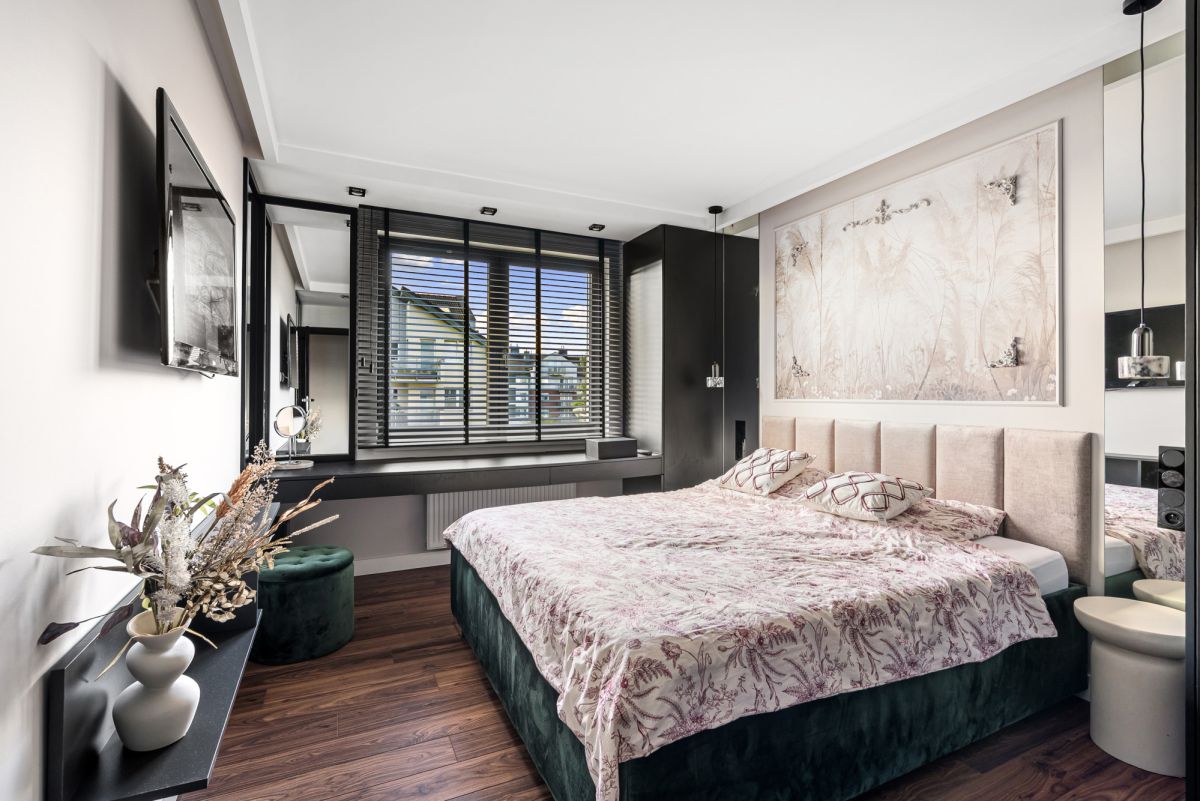 Sypialnia: łóżko kontynentalne z dodatkową powierzchnią do przechowywania, szafa garderobiana, toaletka, telewizor.