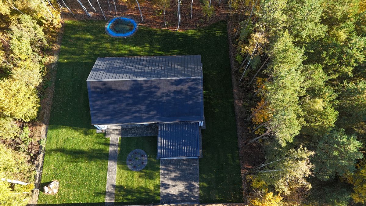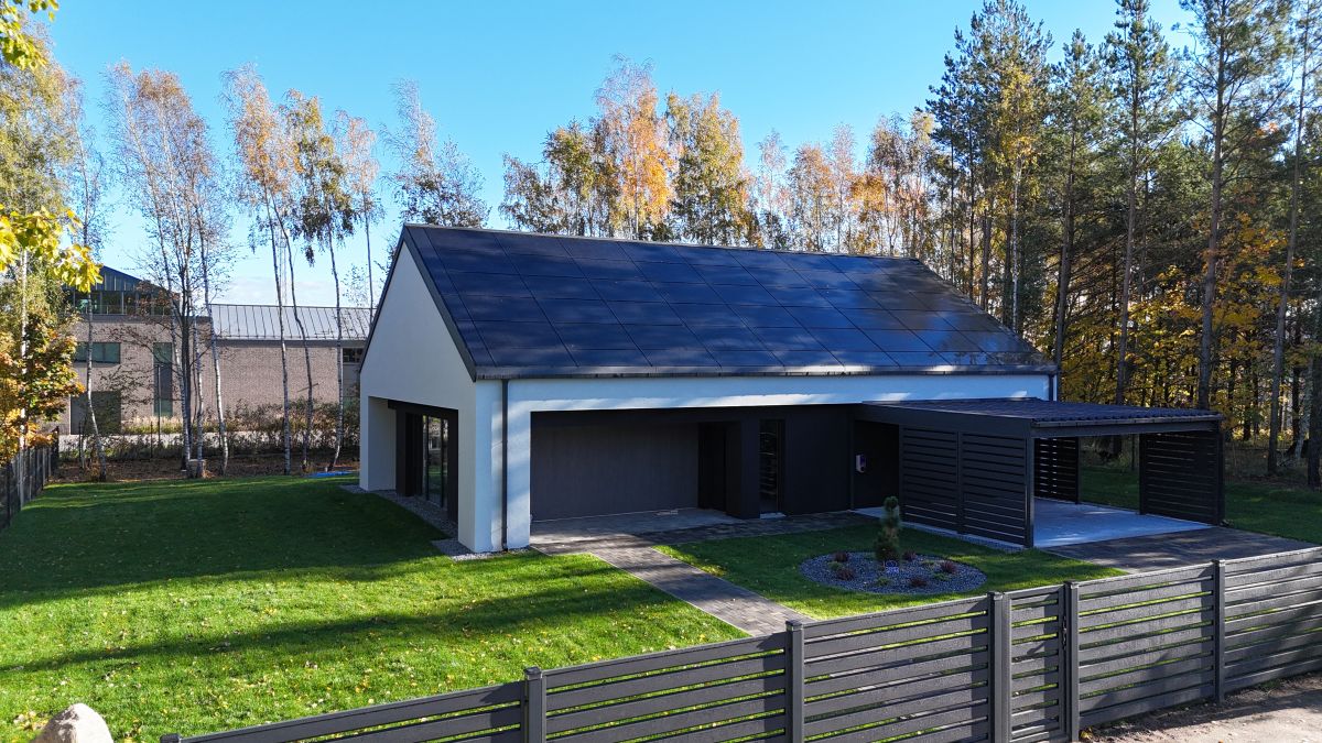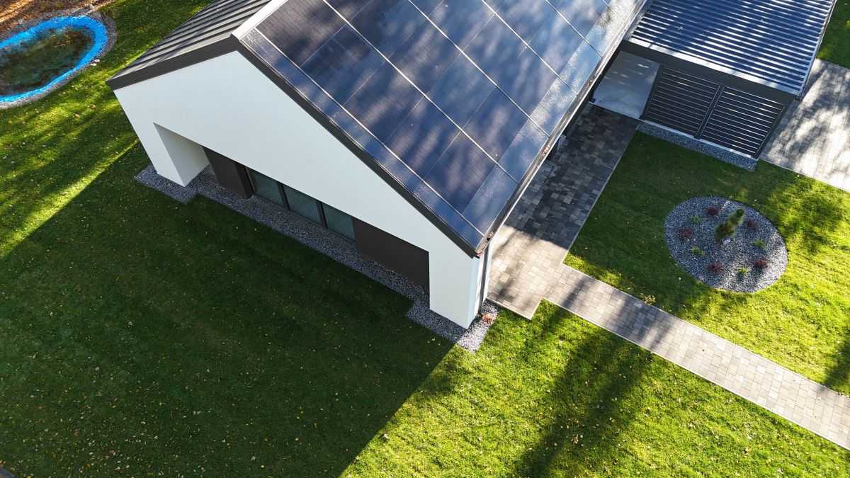 drzwi antywłamaniowe, okna PCV trzyszybowe, sześciokomorowe, dach dwuspadowy hybrydowy solarny zbudowany w technologii Sunroof + inwerter hybrydowy, przestronna wiata garażowa na dwa duże auta z wbudowaną ładowarką do samochodów elektrycznych!