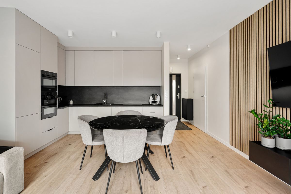 Salon to miejsce stworzone do wspólnych posiłków, rodzinnych rozmów i chwil relaksu. Duże przeszklenia zapewniają piękne doświetlenie wnętrza przez cały dzień, a bezpośrednie wyjście na taras i do ogrodu zachęca do spędzania czasu na świeżym powietrzu. Kuchnia w zabudowie z wyposażeniem AGD, oferuje dużo miejsca do przechowywania. Łazienki z zabudowami.