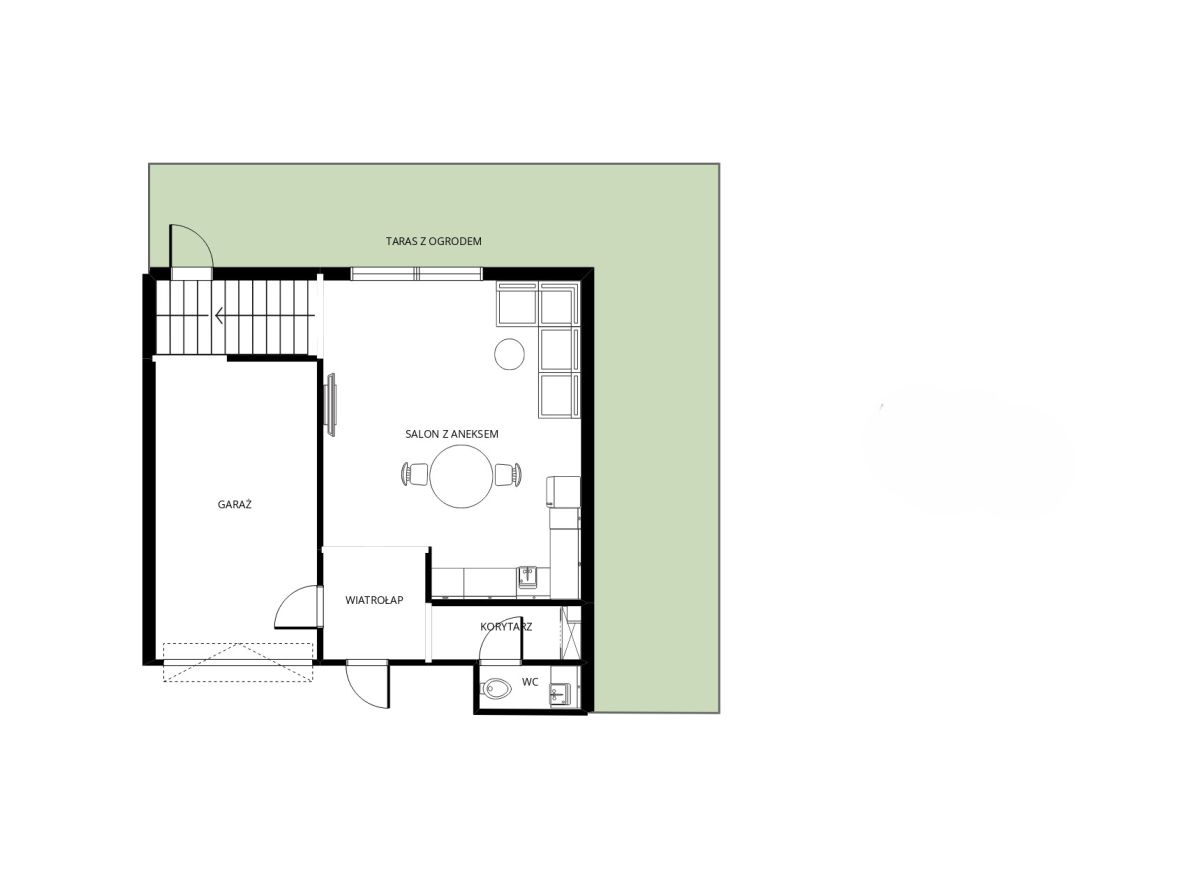 – salon z aneksem kuchennym o powierzchni 22,36 m2 z wyjściem do ogrodu,