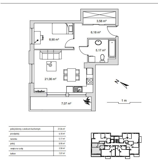 Prezentowana nieruchomość to dwupokojowe mieszkanie z balkonem w budynku z cichobieżną windą o powierzchni 44,89m2, w skład którego wchodzą: