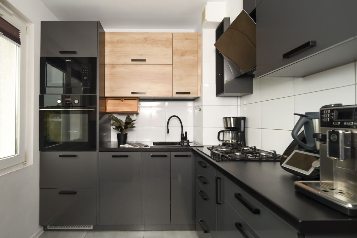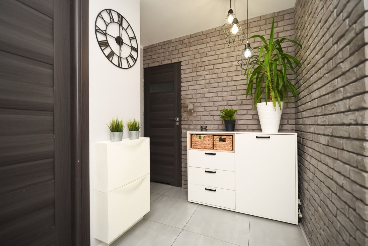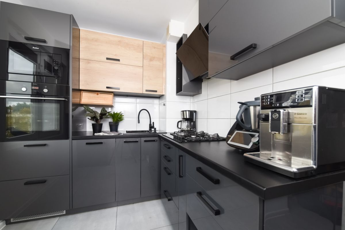 Kuchnia w zabudowie wraz ze sprzętem AGD (płyta indukcyjna, piekarnik, okap, zmywarka), lodówka wolnostojąca. Na podłogach gres oraz panele. W przedpokoju oraz sypialni duża szafa w zabudowie.