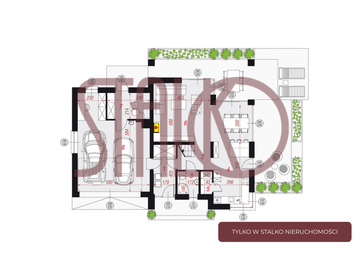 Parter: wiatrołap (7,12m2) przestronny hol (4,65m2), słoneczny salon z wyjściem na taras oraz otwarta na salon kuchnia z jadalnią (47m2), łazienka (3,9m2). Na parterze znajduje się również kotłownia, a także bardzo duży garaż dwustanowiskowy (46m2)