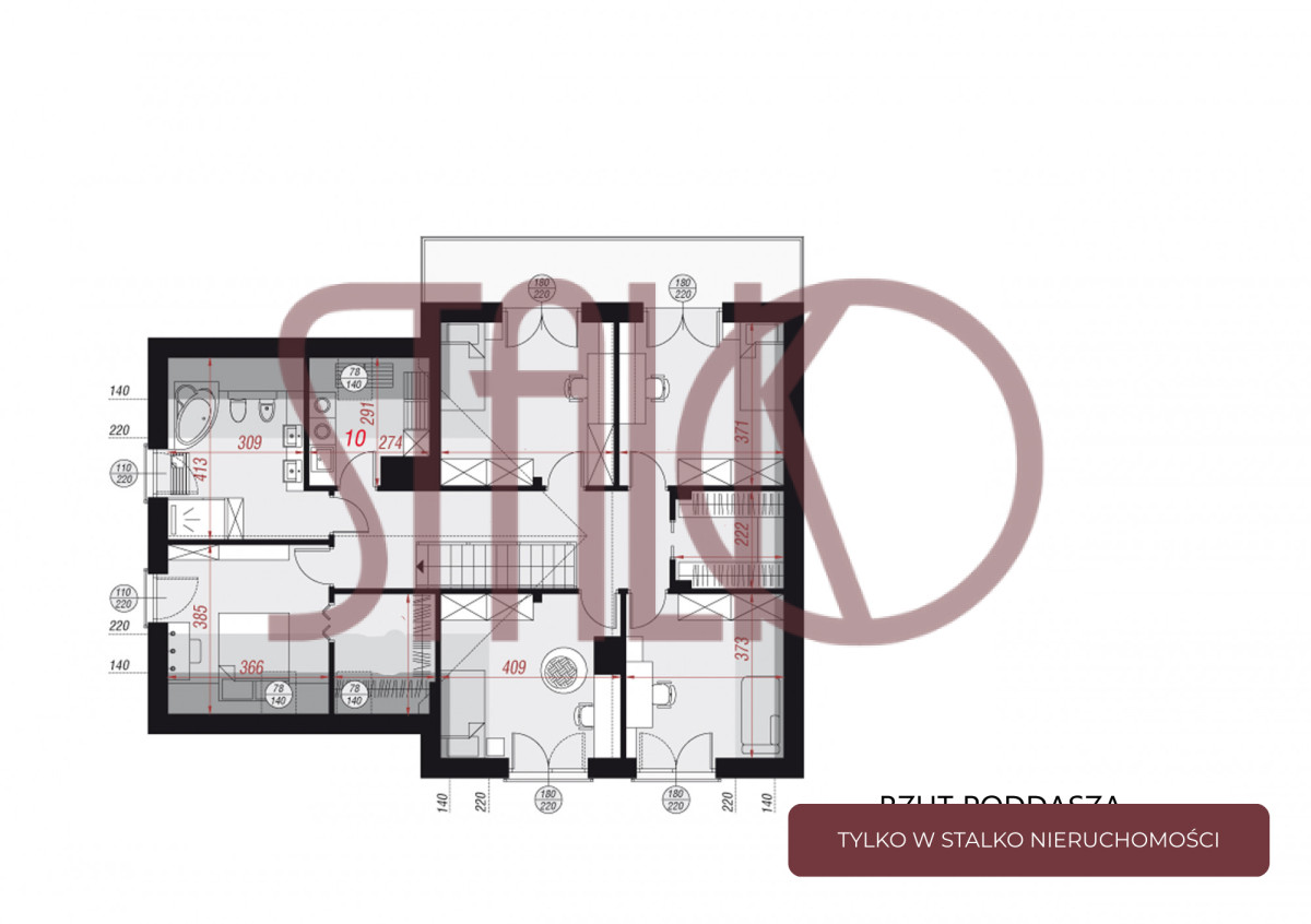 Poddasze: wygodna sypialnia (28m2), dwie garderoby (5,16m2 i 5,98m2), trzy mniejsze sypialnie (13,10m2, 14,36m2, 13,79m2), hol (16,55m2), łazienka i pralnia (20m2).