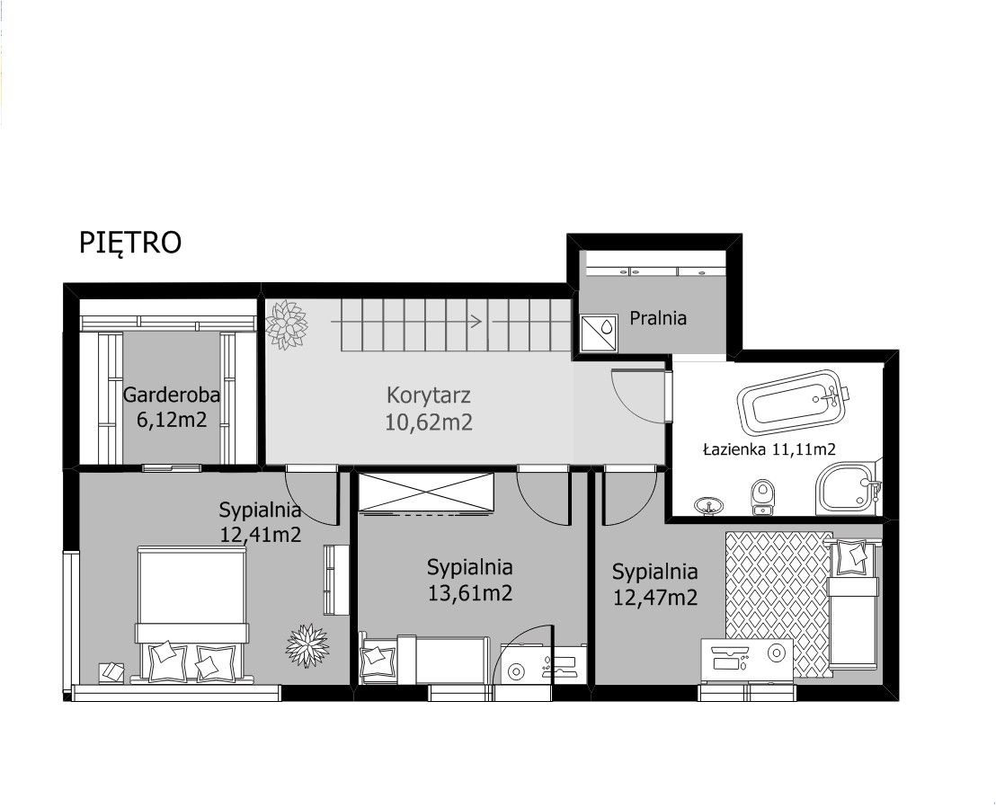 – trzy sypialnie (13,61m2/12,47m2), w tym jedna z garderobą (12,41m2+ 6,12m2),